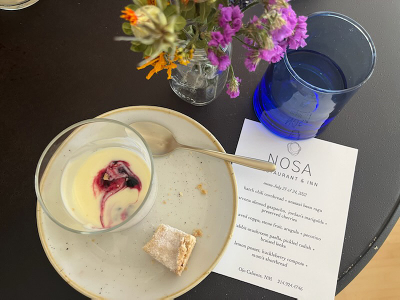 Recently I was invited to the “soft opening” of NOSA Restaurant and Inn, located at Rancho Ojo in Ojo Caliente. This fabulous spot is approximately five miles from Ojo Caliente Hot Springs, 45 minutes from Santa Fe, and a peaceful drive up north. I wish I had taken more photos of the duck/mushroom paella or custard dessert with wild berries. The restaurant is open for brunch Saturday and Sundays, until they get their liquor license (soon); then chef Graham Dodd and the owners will offer a full schedule. To experience this very, special country inn go to www.nosanm.com